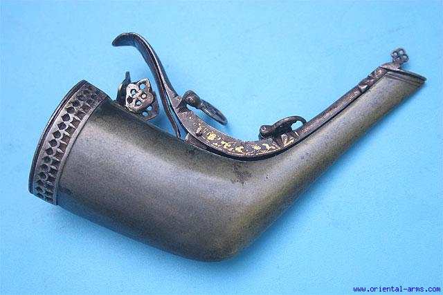 Up for sale is this rare and one of a kind steel powder flask, Persia, most probably late 18 C. made entirely from wootz (Damascus) Steel, with beautifully pierced cover and gold inlaid lever, in full working order. Total length 5 inches. Very good condition. |
