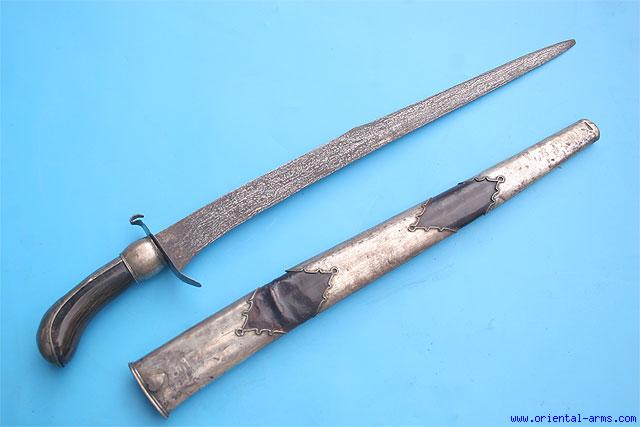 Up for sale is this unusual Pedang Lurus - The short sword from Java, Indonesia. The short, down curving blade is 17 ½ inches long. It is single edged with a long double edge tip and forged from fine pamor steel. The handle is beautifully carved black horn with a silver covered back and pommel top. The scabbard is wood covered with dark brown leather and mounted with silver bands, somewhat reminding scabbards of European military swords. Total length 22 inches. Very good condition. Seams of the leather cover partially open. Minor dents to the silver. Very attractive price. |