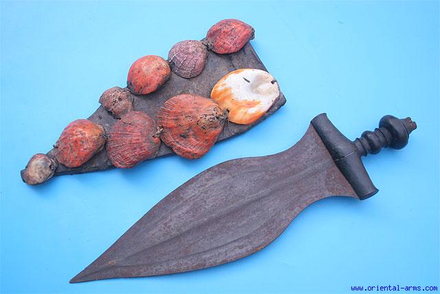 The swords and daggers of the Baule tribe were very rare and sought after by collectors of African weapon / tribal arts. The Baule people reside in Ivory Coast and Neighboring Ghana and known to be masters of wood work and wood engraving. We offer here for sale a classical dagger / short sword of the Baule. The blade is leaf shaped, 13 inches long 5 inches wide and very well forged. The handle is carved hardwood highly polished. The scabbard is wood, covered with hide and set with red painted shells, which were added only to weapons of highly prestigious owners. Total length 13 inches. Very good condition. Few of the shells are partially loose. Age cracks in the handle and damage to the pommel tip. A very rare authentic piece. |