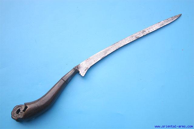 mostly used by the Acehnese people from North West Sumatra (see Stone Glossary, fig. 106 number 4 page 85). The blade is 9 1/2 inches long down curving and single edged. The hilt is black horn lightly up-curving. Total length 15 inches. Good condition. Good patina on the blade with few minor pitted spots. Very good shining age patina on the handle. A crack in the handle base but holds solid. This items comes with its original scabbard, unfortunately broken and damaged (Not shown). A very nice piece from the second half of the 19th C attractive and decorative item. It is offered here at a very low price.