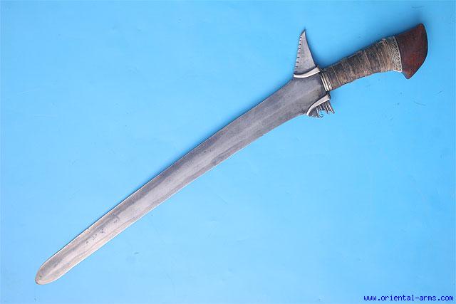 This Moro kris sword is a fighter. A good deadly sharp blade, 21 inches long, forged from laminated steel with hardened edges. Wood grip bound with thread and polished hardwood pommel. Two silver clamps reinforcing the handle to the blade. Total length 26 inches. Very good condition. |