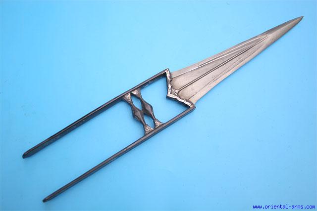 Up for sale is this very good armor piercing big Kattar push dagger, with a heavy blade, forged from very good Indian Wootz (Crystalline) steel with impressive thickened tip. Blade length12 inches. Cross bars engraved and covered with silver (Now mostly gone). Total length 22 inches. Very good condition. Very minor forging flaw on the blade. No scabbard. A big and very Impressive dagger. |