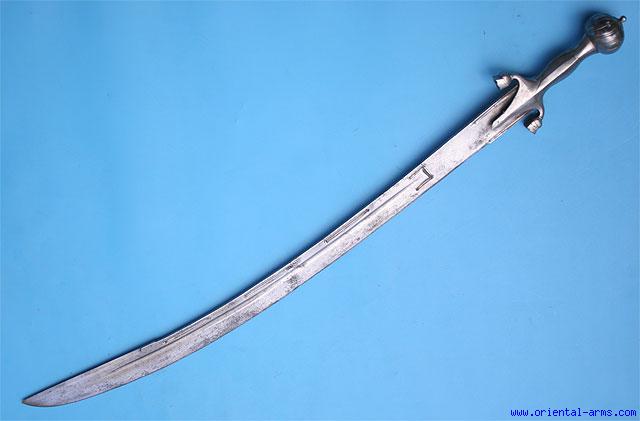 The Pulwar’ is the Afghan relative of the Indian Tulwar. The Pulwar hilt has a very distinct shape, with down curving quillons. The one offered here for sale is a fine heavy fighting sword, with well forged steel blade, 30 inches long, well fullered with a 9 inches raised back edge. The steel handle is of typical quilon shape but with a ball shaped beautifully ribbed pommel (scarce version) . Total length 35 1/2 inches. Very good condition. Blackened spots and lightly pitted areas on the blade. This sword comes with a newly made Indian style scabbard (not shown). |