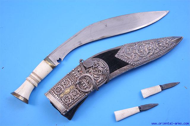 This very good khukuri is a presentation Kothimora, early to mid 20 C. Blade 10 inches long. Brass bolsters, bone grip and brass pommel cover. Wood scabbard covered with black velvet with finely chased and pierced silver mounts. The locket is bound with the original silver chain mounted with a 1916 1/4 Rupee coin and engraved on its top part PRESENTED To Maj. B. BONNIFACE T. D . . This Kothimora comes with accompanied two small (somewhat crudely made) Chakma, also with bone handles. Total length 14 1/2 inches. Very good condition. This Khukuri comes from the collection of John Powell, SF, a world known collection of Nepalese and related weapons. |