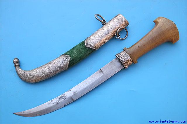 Up for sale is this very fine and early Koumaya Dagger from Morocco, dated to 1314 ( 1896 in the Gregorian calendar). Classical blade, 9 1/2 inches long, double edged at its lower half and single edged at the top. The handle is carved from a single massive piece of Rhino horn with a very clear fibrous structure. Chased silver grip collar. Wood scabbard covered with green velvet and mounted with chased silver locket and chape marked with silver proof mark (one dated to 1314). Total length 15 1/2 inches. Very good condition. Minor pitted spots at the center of the blade. |