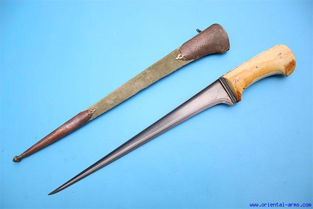 A very fine ‘KARUD’ (the common name for a ‘Pesh-Kabz’ with straight blade). from North India or Afghanistan origin. A very fine wootz blade 12 inches long with acute point and reinforced T spine. The grips are elephant ivory with good age patina. The grip strap and bolsters are steel. The scabbard is wood covered with pale green velvet and mounted with engraved gilded copper fittings. Total length (in scabbard) 19 1/2 inches. Very good condition. The gilding of the scabbard mounts is mostly gone. A very high quality item for the advanced collector. |