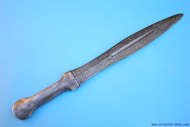 This very interesting short sword is Persia, Qajar period, late 19 C. It shows influence from both the Northern regions Qama daggers and Persian late 19 C. revival swords. Blade is leaf shaped, with a central fuller, decorated on one face with gold koftgari work. Whole steel handle. Blade length 13 inches. Total length 19 inches. Good condition. Some losses to the gold koftgari work. Lightly reshaped blade tip. . |