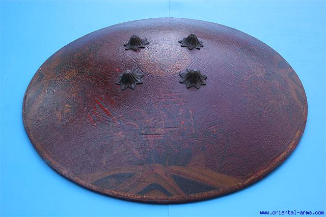 This shield is coming from Rajhastan, India 18 C or a bit later. Made from the hide of a buffalo, 21 inches diameter, beautifully hand painted with brown, yellow and black colors on dark red background and set with four ribbed brass bosses. Original velvet covered hand cushion and handles (torn) on the red painted inner side. Very good condition with age cracks on the paint. |