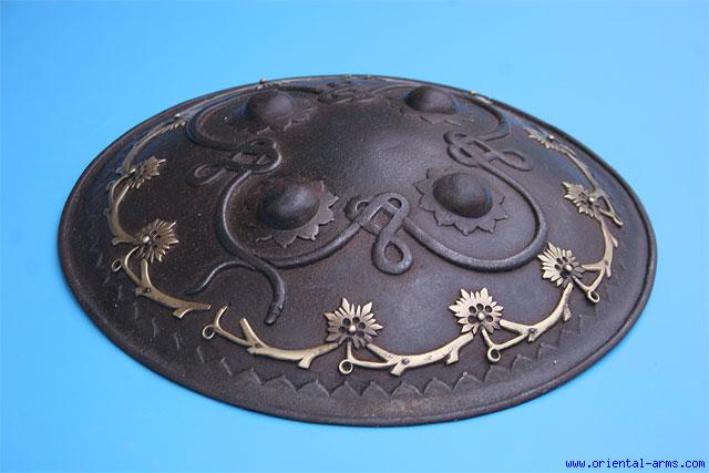 Up for sale is this buckler shield, most probably Indian, late 19 to early 20 C. Steel dome 12 inches in diameter with steel and brass floral decoration. Very good condition. Good dark age patina with patches of light rust. Two brass flowers are missing. Inner cushion and handle straps are missing. Very low price. |
