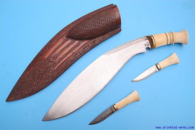 Up for sale is this very fine Khukuri Knife property of Field Marshall Sir Philip Chetwode, 1869 – 1950, who served in India 1930-1935. Down curving heavy blade, marked with the supposedly royal armory mark. Ivory handle with gold bolster. Box style wood scabbard beautifully carved. Two accompanying karda, also with ivory handles and gold collars. Blade length 14 inches. Total length 19 inches. Very good condition. A very fine Khukuri. |