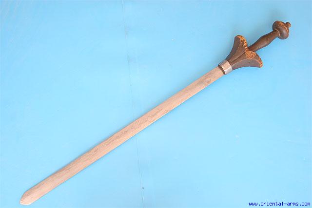 Up for sale is this rare sword from South India. Straight blade 26 inches long, with flat diamond cross section, forged from good laminated steel. Massive wood handle with steel collar. Total length 38 inches. Very good condition. Very good age patina on the wood with minor chips. A rare sword. chips on the handle. |