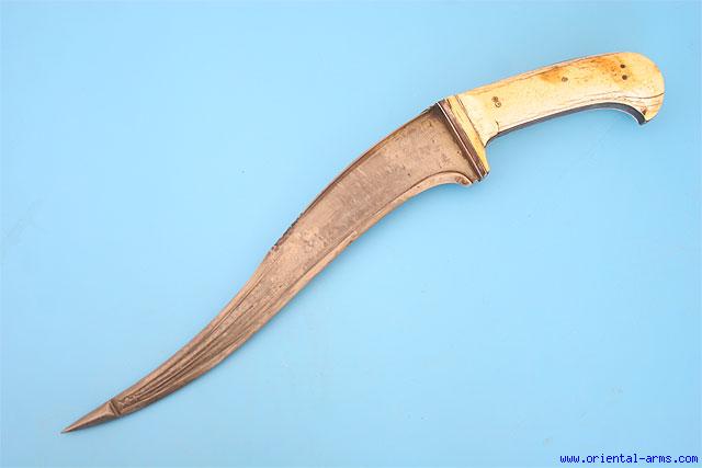 This dagger is a Pesh-Kabz , a member of the family of the Karud and a Khybar Knife, but with a re-curving blade. The whole family of such daggers is common to India, Persia and several Central Asian countries. The blade is 10 inches long, heavy, with a pronounced T spine, reinforced edge and thickened armor piercing tip. It is forged from wootz (Damascus) steel The grips are of elephant ivory, the grip strap and bolsters are steel. Total length 14 1/2 inches. Very good condition. The wootz pattern is not perfect and disappears in several areas. No scabbard. |