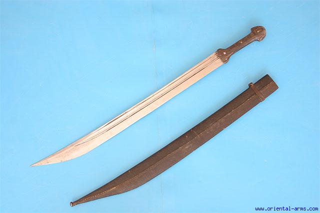 This sword is of Persian origin and it is also known as Quadara. A similar sword is found in central Asian countries and in the Caucasus but sometimes called Qama. This specimen has a 24 inches long single edge blades with a 7 inches false edge. The blade is fullered, marked with a deep maker mark with a gold foil inlaid on the mark. The grips are black Buffalo horn mounted with three rivets. Original scabbard, covered with black leather. Total length 31 inches. Very good condition. Minor grinding scratches on the blade. |