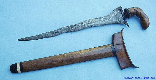 A very good Sumatra Keris, probably 19 Century, with a 14 inches wavy blade of good interesting and unusual pamor pattern clearly noticed all over the blade. Classical wood hilt Scabbard with bone / horn combination tip. Very good condition.