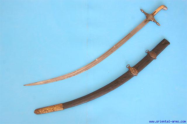 This Persian Shamshir is a fine quality sword The blade is 30 inches long, narrow, single edge and finely fullered. It is forged from good Wootz (Damascus) steel with pattern of medium contrast, marked with gold inlay work and engraved with the owner name on the spine. The grips are bone and the cross guard, grip strap and pommel cap of steel. Leather covered scabbard with a gold decorated belt suspension ring (one) and scabbard chape. Total length 35 1/2 inches. Very good condition. The grips and pommel cap are restored. The upper suspension ring is a replacement. The leather of the scabbard is partially restored. A very nice sword. |