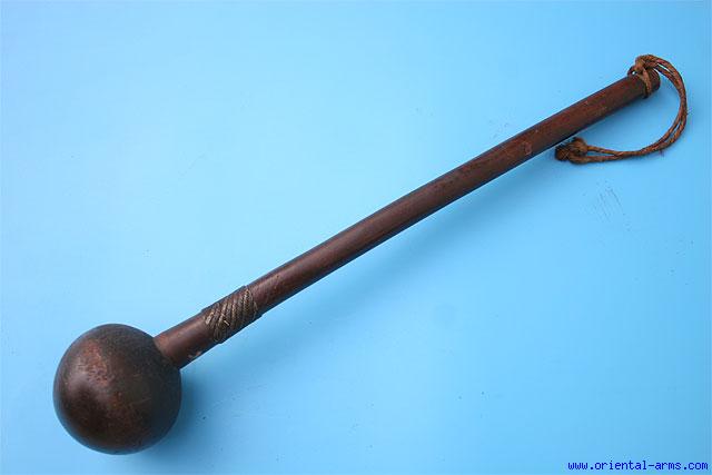 A fine 19 C. Knobkerrie of the Zulu. Nice symmetrical big size head, 3 1/2 inches in diameter and a 16 inches long haft bound with a band of braided steel and brass wires - the classical Zulu style decoration. Very good condition. Age crack in the club head. |