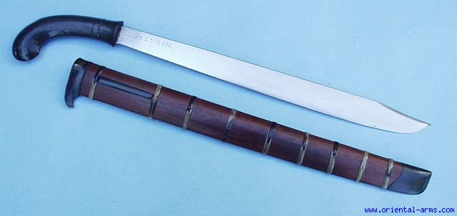 This is a very interesting short sword from Indonesia. It was made in the village of TJIBATOE ( CNIBATU in the modern Indonesian spelling). During the end of the 19th and toward the very early 20th Century, this village was famous in the production of edged weapons of various shapes, mainly Goloks. Many blades were done as a special order for foreigners, mainly Dutch people residing in Indonesia. This one here is an excellent example of a mix of Indonesian and western styles. The blade reminds that of a big Bowie knife, heavy, 17 inches long with a clipped tip. The name TJIBATO is inlaid in brass onto the blade. In contrary to the European Bowie style blade, both the black horn hilt and the wood scabbard are of typical Javanese style. The wood scabbard has a black horn mouth and tip and black horn belt attachment loop and it is reinforced with bands of light colored horn. Excellent condition. |
