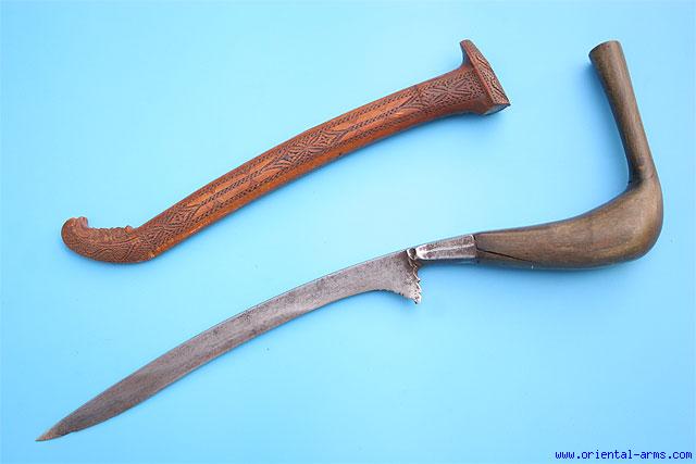 A very nice RENTONG knife / dagger from the Malay Archipelago. The version offered here is mostly used by the Achenese people from North West Sumatra (see Stone Glossary, fig. 106 number 4 page 85). The blade is 8 1/2 inches long down curving and single edged, forged from fine laminated steel. The hilt is horn with the pommel end sharply up-curving. The scabbard is wood lightly chiseled in geometrical design on one side and very finely engraved with delicate design on the other side. Total length 15 inches. Very good condition. Minor pitted spots on the blade. Age cracks on the handle horn and chips to the scabbard mouth. Altogether a very nice piece from the second half of the 19th C attractive and decorative item. |