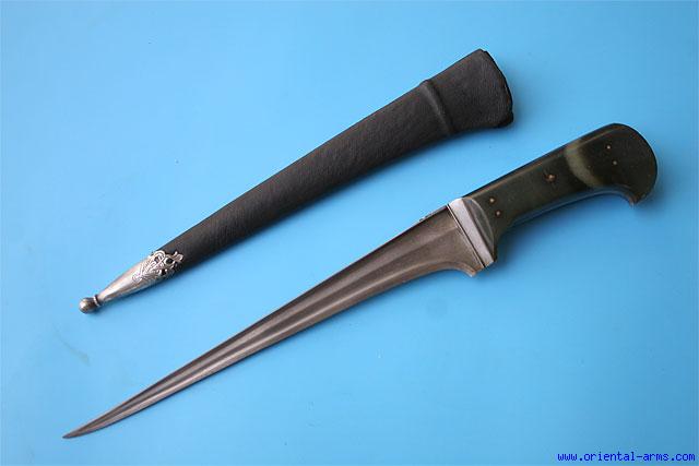 A very fine ‘KARUD’ (the common name for a ‘Pesh-Kabz’ with straight blade). from North India or Afghanistan origin. A very fine high contrast Persian wootz blade 9 1/2 inches long with a central rib, acute point and reinforced T spine. The grips are Dark green jade ( or Jadeite) and steel grip strap and bolsters. The scabbard is wood covered with blak leather and mounted with silver tip. Total length (in scabbard) 14 1/2 inches. Very good condition. Scabbard leather and tip are restored. A very high quality item for the advanced collector. |