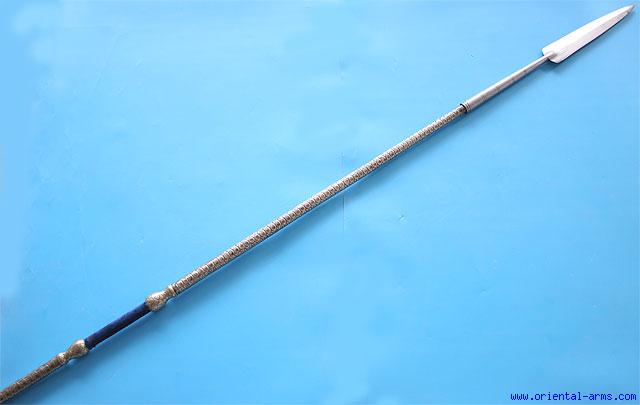 This Spear is Indian, mid to late 19 C. Leaf shaped steel head is 17 inches long, 9 inches blade and 8 inches socket. The haft is 79 inches long constructed from two halves, each finely covered with chased silver with the central handle part covered with fine blue velvet. The steel tail is 10 inches long. Total length 88 inches. Very good condition. A very fine item. |