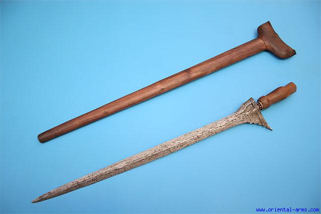 A Keris Penjang , also sometimes refered to as Execution Keris from Sumatra. This rare type of Keris was supposedly used to execute criminals. The long narrow blade was inserted above the collarbone of the sitting executed person and pushed down directly into the heart, causing instant death. The blade of this specific Keris is 20 inches long, forged from very fine pamor steel. The hilt is wood. Metal mendak decorated with colored stones (glass ??) Wood scabbard. Total length 29 inches. Very good condition. Few blackened spots on the blade. The corner of the wrongka (cross piece) is lightly damaged. |