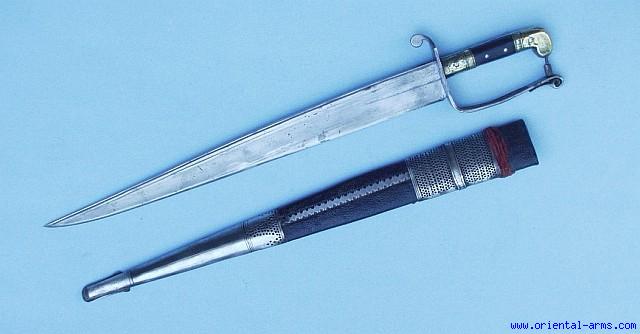 This is a very interesting variant of the famous Khaybar sword from Afghanistan. In 1889 A standards sword was issued to the Afghani military forces. Prominent officers however, were allowed to use their own swords but to fit them with the standard military hilt. Therefore one can find a variety of blades from the period fitted with the same hilt. I have seen Khaybar sword blades, Tulwar blades and even a wootz shamshir blade so fitted. The sword offered here is one of such combinations: A massive Khaybar blade 19 inches long with a pronounced T spine. Standard military shape hilt with brass / horn grips and steel guard. Very nice and unusual scabbard with decorative pierced steel fittings. Very good condition. Minor blackened areas on the blade. Signs of old repairs to the hilt. Scabbard with the original leather and fittings. |