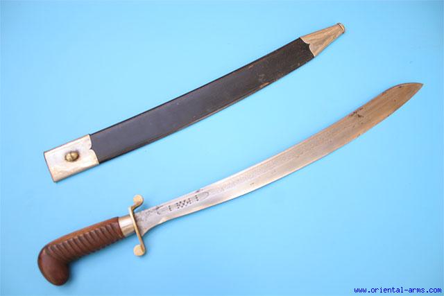 This is a very interesting short sword from Indonesia. It was made in the village of TJIKEROEH (CHIKOREA in the modern Indonesian spelling), famous in the production of edged weapons of various shapes. Many blades were done as a special order for foreigners, mainly Dutch people residing in Indonesia. This one here is an excellent example of a mix of Indonesian and western styles. The blade is short and heavy, 18 inches long, with a down curving spine tip. It is very finely engraved and signed WIR A.Z.M TJIKEROEH, 1919. Hardwood ribbed handle and brass cross guard in the style and shape of a European short sword. Black painted wood scabbard with white metal mounts. Total length 24 1/2 inches. Very good condition. |