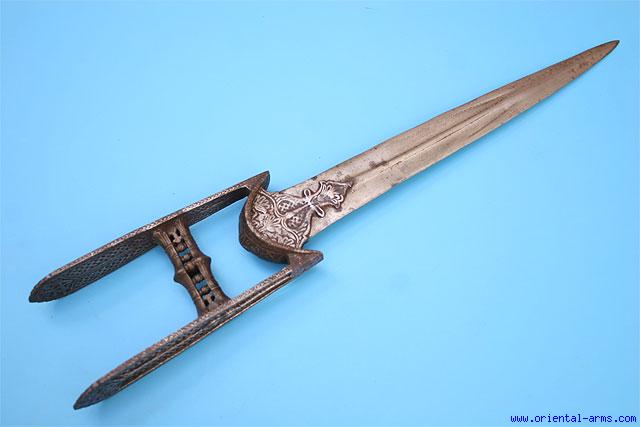 Up for sale is this Fine early example of a Kattar push dagger , India, 17 C. Good Wootz blade with central rib Slender blade 13 inches long, riveted to the whole steel handle. Wide 3 1/2 inches handle, with very finely pierced and chiseled side bars and cross bar. Total length 19 1/2 inches. Very good condition. A fine rare item. |