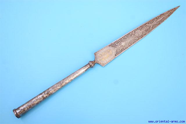 From the Qajar period, Iran, end of the 19 C. Comes this spear head decorated in a classical Qajar style. 12 inches blade, finely etched with human figures with snakes and fishes on a floral background. The base of the spear blade is decorated with gold and silver koftgari inlay work. The 9 inches socket is etched in a pattern to imitate Damascus steel. Total length 21 1/2 inches. Very good condition. |