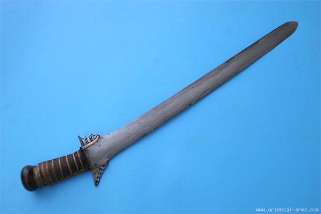 This Moro Kris sword is a fighter. A straight blade, deadly sharp, 22 inches long forged from very good laminated steel. Wood grip bound with thread and reinforced with rattan binding. Round shaped polished wood pommel. Silver clamps reinforcing the handle to the blade. Total length 26 inches. Very good condition. Minor damage to the rattan binding. No scabbard. |
