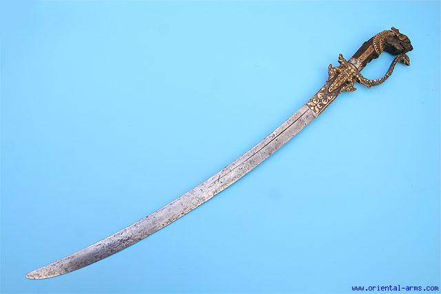The Kastane is the national sword of Sri-Lanka. It is characterized by its short curved blade, usually of mediocre quality and highly decorative hilt and scabbard. Here we have a good early example, late 17 to early 18 C. with a 23 inches steel blade, almost 8 mm at the base, inlaid with brass inserts. All hilt parts are of great decorative values – A piece of art by itself: The dark horn grip with a monster styled pommel and engraved and chiseled brass mounts. The monster styled quillons, the D guard and the langet all beautifully executed in brass. Total length 28 inches. Very good condition to age Good age patina on the blade. Minor chips and losses to the brass mounts on the handle. No scabbard. An unusually early decorative piece at a very attractive price. |