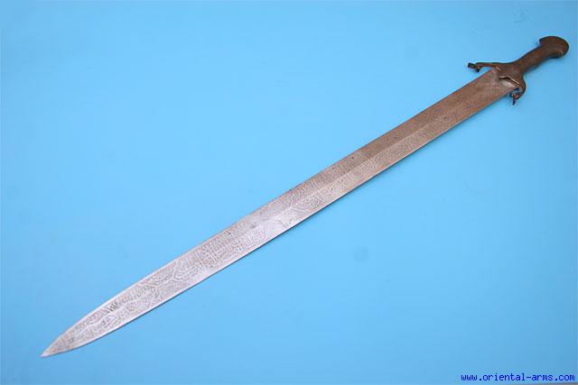 We offer for sale this beautiful 19 Century Persian straight sword also known as Revival sword, as it was reviving the use of old 15 C style Islamic straight swords. This beautiful blade is 28 inches long, 2 inches wide at the top, and although thin is very solid and both edges are sharp. The entire blade is elaborately etched on its two faces in the typical Qajar style with Arabic inscription. The hilt is steel, with down curving quillons, and was decorated with silver koftgary work, now mostly gone. Total length 33 inches. No scabbard. Very good condition. One of the quillons is lightly bent. |