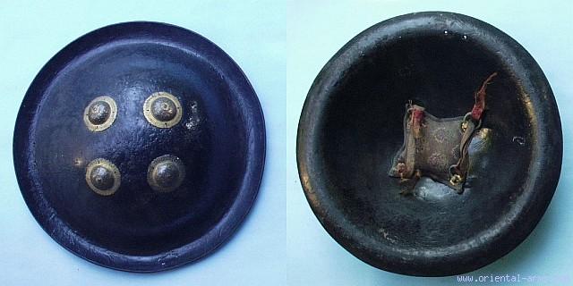 This is a very good Indo-Persian hide shield. The shield diameter is 16 ½ inches and the height is 5 inches – much higher than the 3 inches height common on such shields. It is made of heavy hide (Buffalo ??) painted black with four engraved and gilded steel bosses. Also the inner rivets are gilded. Very good condition. There are some age cracks in the black paint. The hand cushion is original and in good condition but one of the hand strap is torn. Excellent item. |
