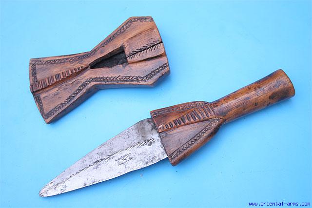 Up for sale is this small dagger, most probably Shona from Zimbabwe, early to mid 20 C. Short tapering blade nicely engraved, 4 inches long. Carved wood handle and scabbard, with the classical aperture at the scabbard center. Total length 8 1/2 inches. Very good condition. |