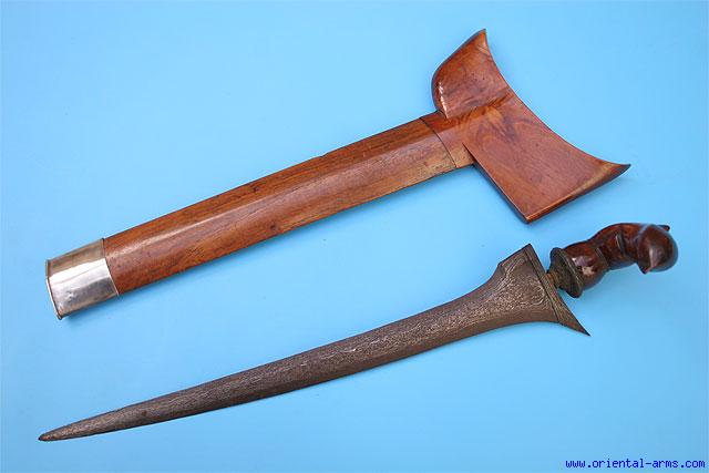 This fine Bugis Keris Dagger has a heavy old slightly curved blade 14 inches long, with clear laminated pamor structure. The mendak is brass. The hilt and the scabbard are carved from a beautifully grained wood, in a classical Sulawezi style with a silver scabbard tip. Total Length 17 inches. Very good condition. Very reasonable price for the quality and condition. |