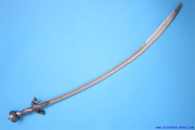 The Pulwar’ is the Afghan relative of the Indian Tulwar. The Pulwar hilt has a very distinct shape, with down curving quillons. The one offered here for sale is a very good heavy fighting sword, with well forged heavy steel blade, 30 inches long, well fullered with a raised 9 inches back edge (Yelmen). The steel handle is of typical pulwar shape, whole steel and beautifully chiseled all over. Pierced hemisphere shaped pommel. Total length 36 inches. Very good condition. |