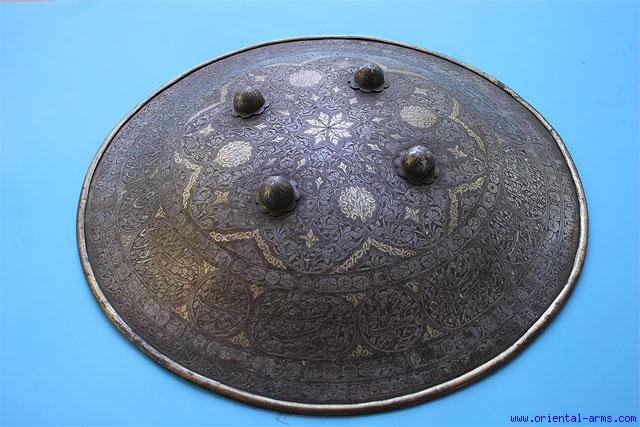 This very good shield is Indian, early to mid 19 C. 18 inches diameter, heavy steel finely chiseled with floral design and inscription in Arabic letters and decorated with gold and silver koftgari inlay. The shield is set with four bosses with silver koftgari inlay and mounted with a brass strip around the rim. Original inner red fabric. Very good condition. Losses to the silver inlay (The gold inlay is almost intact). Damaged fabric cover of the inner side. Hand cushion , handles and mounting rings are missing. |