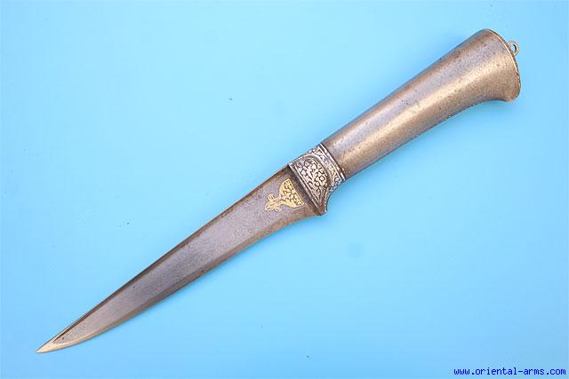 This fine Kard knife is Indian, early 19 C, whole steel construction, wholly forged (both blade and handle) from fine Wootz (Damascus) steel. Blade length 6 inches. Blade with strong T spine and decorated with gold koftgary decoration. Wootz steel handle also decorated with gold koftgary work, with bolsters and pommel cap decorated with silver koftgari work. Total length 11 inches. Very good condition. Minor losses to the gold and silver inlay. No scabbard. |