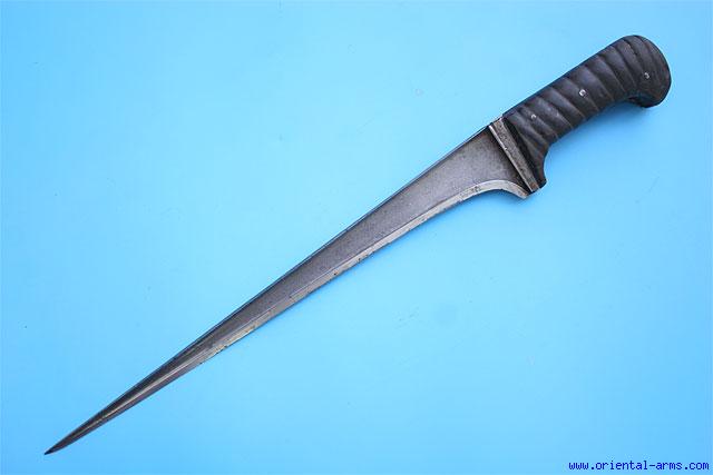 This Karud dagger is the straight back member of the family of the Pesh-Kabz, Choora and Khyber Knife. The whole family of such daggers is common to India, Persia and several Central Asian countries. This one is coming from Afghanistan, early to mid 19 C. The blade is forged from fine wootz (Damascus) steel with good contrast pattern. , 12 ½ inches long, heavy, with a pronounced T spine tapering to an acute tip. The grips are ribbed horn and the grip strap and bolsters are steel.. Total length 17 inches. Very good condition. Minor repairs on the horn grips. No scabbard. |