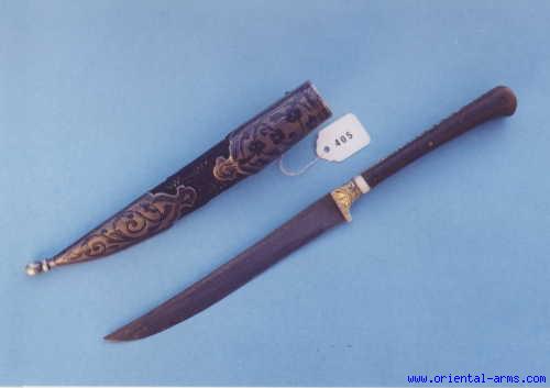 A small but very typical knife / dagger from Bukhara / Uzbekistan. This shape of knife is very common and many newly made Bukhara knives of the very same shape are available today. The 5 inch blade is forged from good quality wootz and the grips are cut from Rhino horn. The scabbard is mounted with heavy silver mounts with Niello decoration. Interesting to note that the Rhino horn grips are carved from an axial cut of the horn, thus the famous fibrous structure of the Rhino horn is seen axially. I have seen such way of cutting the rhino horn for knives grips only on Bukhara knives