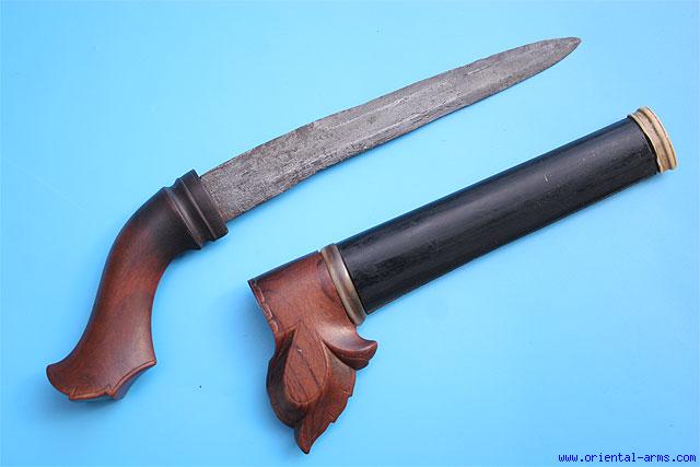 The Badek (or Badik) is a dagger / short sword from Java, Indonesia. It is characterized by its single edge blade with straight back and up-curving edge, and the pistol grip shape handle. This one has a very distinctive blade: 8 inches long with a hollow ground cross section, spear shaped tip and a 6 inches back, forged from good pamor steel. Fine quality grain wood handle. Black wood scabbard with a grained wood mouth, horn spacer and bone tip. Total length (in scabbard) 12 inches. Very good condition. |