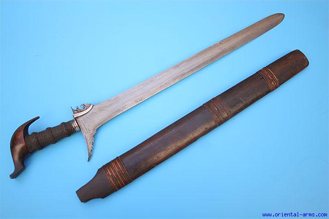 This Moro Kris sword is a fighter. A straight blade, deadly sharp, 20 inches long, forged with a laminated steel core and hard steel edges. Wood grip with Cockatoo style pommel with the original thread binding, silver collar and silver blade clamp is reinforce the handle to the blade. Wood scabbard. Total length 26 inches. Very good condition. Repairs on the scabbard top. |
