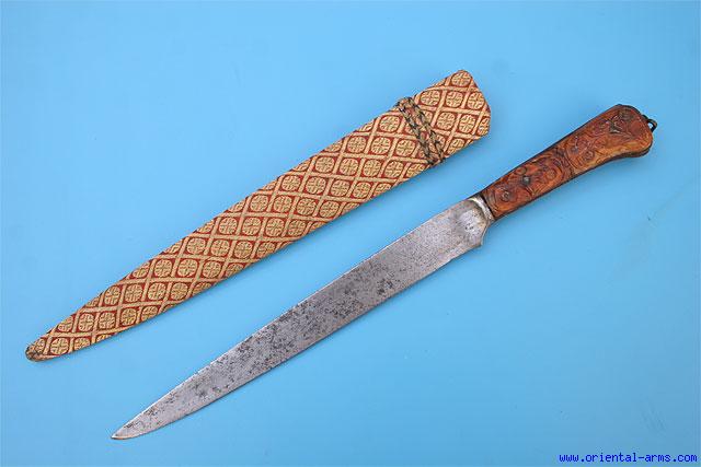 This is an early, probably 18 C. Kard knife from Central Asia, may be Bukhara. 9 inches single edge blade, most probably forged from laminated steel. Bolsters forged in one piece with the blade as common to central Asian similar knives. Finely carved ivory grips with birds animals and flowers. Newly made fabric covered scabbard. Total length 14 1/2 inches. Very good condition. Few blackened spots on the blade. Excellent dark age patina on the ivory grips. |
