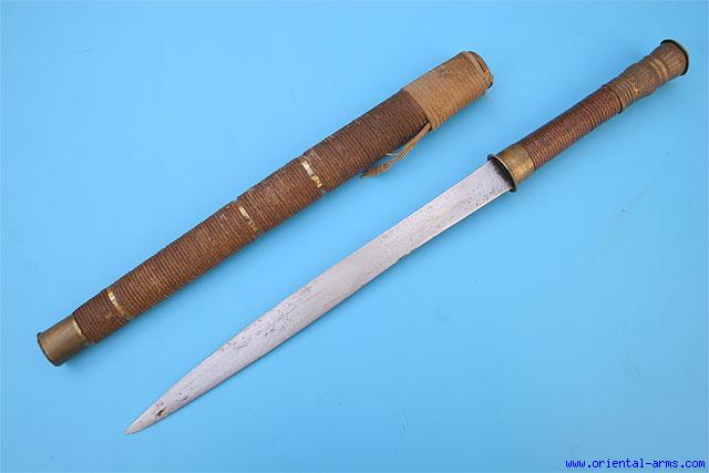 This long knife / short sword is of Burmese origin, late 19 C. Heavy single edge blade 12 inches long with down curving thick spine, 9 mm thick. Wood handle bound with braided rattan rings and mounted with chased brass mounts. Wood scabbard bound with thread and brass bands and brass locket and chape. Total length 200 inches. Simple but knife made for business. Very attractive price. |