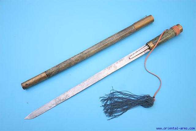 From China. Late 19 to early 20 C. comes this sword stick with a concealed good long blade. Blade 16 inches, single edge, heavy and thick. Handle and scabbard covered with green dyed ray skin, with brass mounts. Brass safty lock for the blade. Total length 22 inches. Very good condition. Add 18.00 Dollars for air mail shipment. See our other selection of Oriental and |