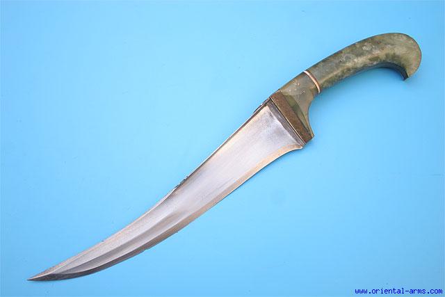 As from the last quarter of the 19 C, around 1880, the European market for decorative arts from the east was rapidly growing. To satisfy this grow, many Indian weapons were produced to meet this market demands. They are mostly characterized by the good quality blades of high Carbon steel and Jade (actually Jadeite), other stones or Mother of Pearl handles of very good workmanship. This style of handles was implemented to many classical Indian blades: Pesh-Kabz, Kards, Khukuries and even Tulwar blades. Here we have a classical example of an Indian Pesh-Kabz knife, 8 1/2 inches blade, deadly sharp with up-curving tip and pronounced spine. The handle grips are made of jadeite and with brass grip strap and bolsters. Total length 12 1/2 inches. Very good condition. Minor nick on the edge. No scabbard |