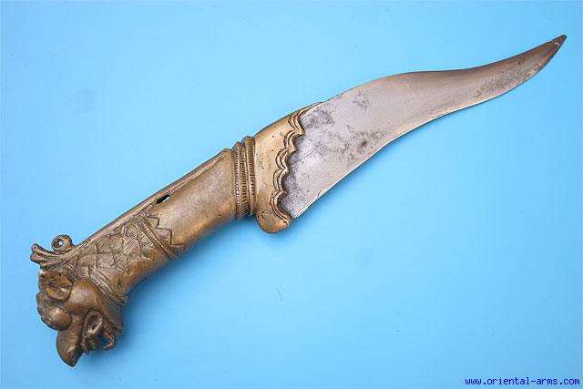 This heavy short dagger is coming from Central or South India, probably early 19 C. The heavy re-curving blade is 7 inches long. The interesting part of this dagger is the brass handle with the pommel in the shape of a Mythological Indian monster. Total length 11 inches. Very good condition. No scabbard. Interesting Knife. |
