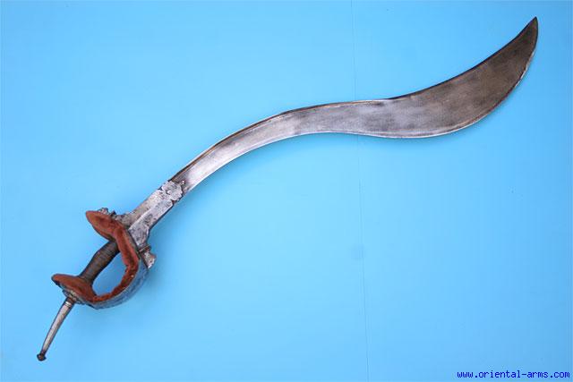 This monster sword comes from India, late 18 or early 19 C. The 28 inches re-curving blade is very heavy, with a very wide blade, strong T spine and with a 10 inches false edge. Basket shape handle (early shape) with a 3 inches curved pommel spike. Total length 32 inches. Very good condition to age. The velvet hand cushion is a later restoration. A very impressive sword. |
