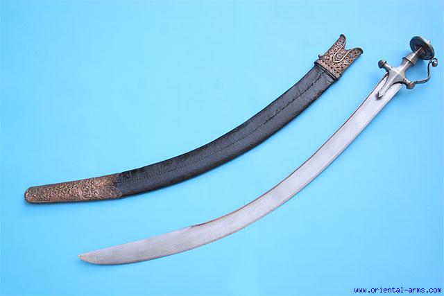 This heavy sword is Indian, late 18 to early 19 C. The wide and heavy blade is 30 inches long, more than 2 inches wide, with a pronounced T spine and 9 inches raised back edged, reminding in a way the blade of the Ottoman Pala sword. The hilt is whole steel, of unusual grip shape. Original wood scabbard with original leather cover and big finely pierced and chased copper locket and chape. Total length 36 inches. Very good condition. A very impressive sword. |