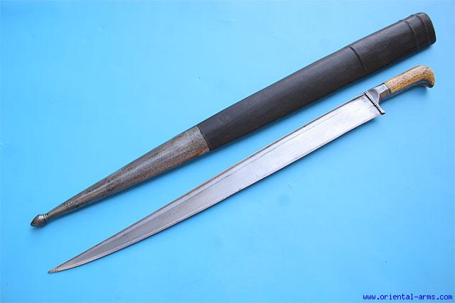 This is a classical example of the famous Khyber sword coming from Afghanistan. The heavy massive blade is 21 inches long, 2 inches wide with a pronounced T spine. The bolsters and grips straps are steel. The grips are bone with good age patina, Original scabbard with steel tip. Total length 30 inches. Very good plus condition. Like in the classical swords of this type, the blade goes all the way into the scabbard and only the pommel end of the handle is exposed. |